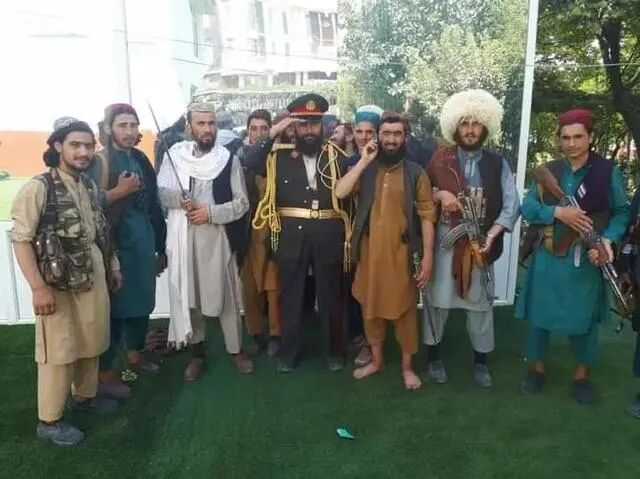 此外,塔利班传出的一张照片在社交媒体上传得很广。照片中,一名塔利班战士穿着并不合身的阿富汗元帅服,形态滑稽地与其他穿着各种服装的塔利班士兵合影。