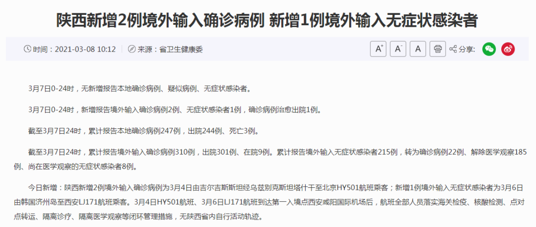 陕西新增2例境外输入确诊病例为3月4日由吉尔吉斯斯坦经乌兹别克斯坦塔什干至北京HY501航班乘客。
