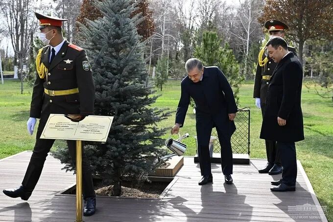 12日当天,乌兹别克斯坦总统米尔济约耶夫与昨日到访乌国的吉尔吉斯斯坦总统扎帕罗夫,在库科萨拉依(Kuksaroy)总统官邸的贵宾大道上种下了一颗树。