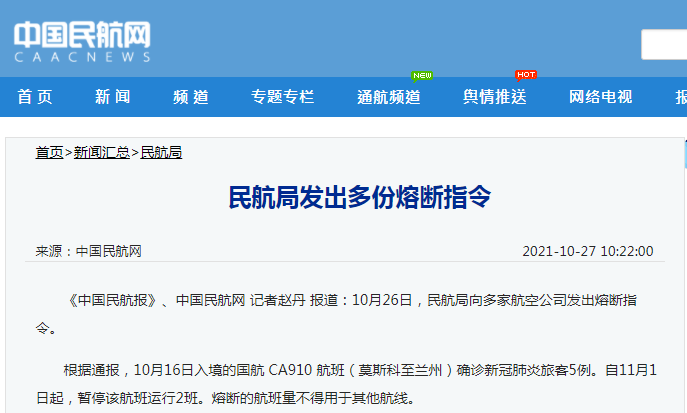 据中国民航网27日消息,10月26日,中国民航局向多家航空公司发出熔断指令。具体通报如下: