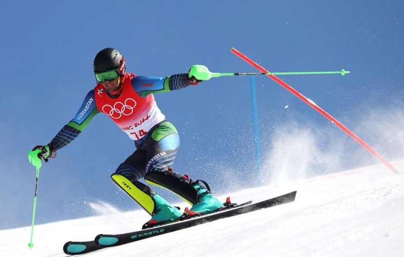 2月16日,代表乌兹别克斯坦参加北京冬奥会的高山滑雪运动员科米尔江•图赫塔耶夫参加了回转比赛。