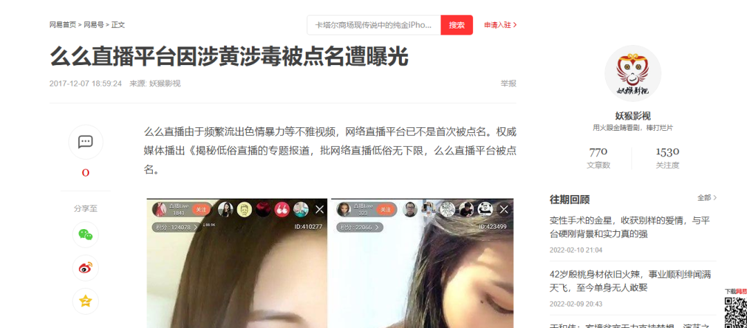 么么直播由于频繁流出色情暴力等不雅视频,网络直播平台已不是首次被点名。权威媒体播出《揭秘低俗直播的专题报道,批网络直播低俗无下限,么么直播平台被点名。