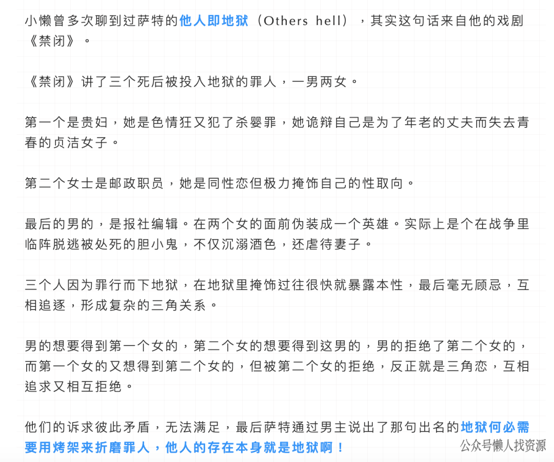 在这篇文章的后半部分,小懒分享过萨特的「他人即地狱」的由来: