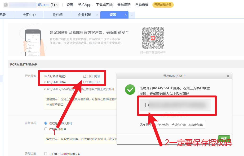 登陆邮箱后,找到设置——打开Pop3/smtp/imp服务。