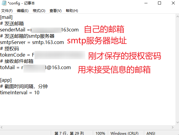 在文件夹里打开Config文件进行编辑参数,在这里可以配置邮箱推送和截图间隔时长等。