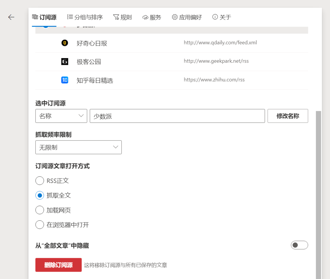 一部分阅读源只能看到摘要的话,我们需要到设置里选中,然后下方选择设置抓取全文