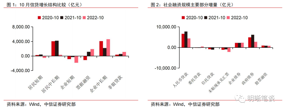 10月金融数据再度回落,实体部门融资需求较弱,政策刺激的持续性仍待进一步加强,宽信用推进的过程依然曲折。10月新增人民币贷款6152亿元,同比少增2110亿元,假期安排以及散点疫情扰动等因素使得实体融 资节奏相对放缓;此外,9月份的信贷大幅高增,背后可能存在部分银行提前启动项目储备,拖累了10月表现。社会融资规模增量9079亿元,同比少增7097亿元,社融同比增速10.3%,较9月下滑0.3个百分点。10月数据再度回落,一方面说明实体部门需求不足的问题依然严峻,另一方面也反映出政策刺激效果明显但持续性不强,对于“宽信用”的提振效果还需进一步观察。
