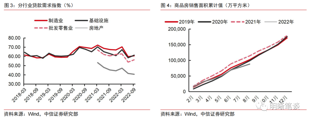 在各类“宽信用”政策组合下,实体部门信贷需求有所回暖,但是从绝对水平来看仍处于相对低位,尤其是房地产行业表现持续下行,信贷恢复节奏和恢复效果仍存不确定性。2022年以来,央行通过下调政策利率和存款准备金率、推动存款利率市场化改革、设立专项再贷款等一系列政策,引导实际贷款利率稳中有降,培育和激发实体经济信贷需求,保持人民币贷款适度增长。从不同行业的贷款需求指数来看,基础设施和制造业贷款需求恢复较好,我们认为主要受益于政策性银行信贷额度支撑以及开发性、政策性金融工具,同时地方专项债资金加速落地也会撬动基建领域的融资需求。然而房地产行业表现较弱,居民预期仍有待改善,期房交付担忧情绪抑制居民加杠杆意愿。近期地产政策边际放松持续,但地产销售高频数据仍未明显好转,政策效果尚待进一步观察。