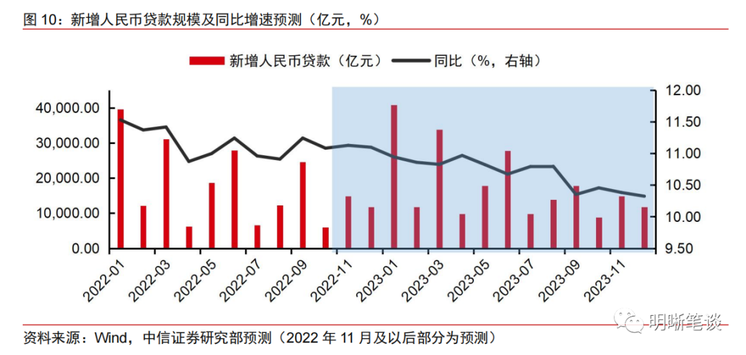 若LPR如期下调,预计2023年上半年信贷增长可能会有超季节性表现,一季度信贷或将迎来“开门红”。同样地,2023年社融同比增速将呈现先上后下的走势。2022年以来政府部门适时灵活运用多种政策工具,发挥总量和结构双重功能,加大对实体经济的支持,尤其是下半年来各类专项再贷款、开发性政策性金融工具等,我们认为其对于信贷的提振效果将延续至2023年初。在降成本和宽信用目标下,我们判断后续LPR报价仍有下调空间,且非对称下调概率更高,如果5年期LPR如期下调,我们认为信贷会有更明显的回暖,同时基本面预期也会有所改善。综合来看,预计2023年全年新增人民币贷款规模有望超过22万亿元,且发行节奏上也会更多集中在上半年,一季度信贷或将迎来“开门红”。同样地,2023年社融同比增速将呈现先上后下的走势,高点可能出现在一二季度交接之际,同比增速或将逼近10.4%,全年同比增速可能在10.1-10.2%附近。