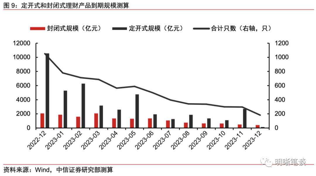 理财与债基不同,投资者看到净值回撤严重时能否立刻赎回取决于理财产品的运作模式,此前22年12月为理财到期的高峰期,部分产品的赎回压力已得到充分释放,而目前只有定开产品到开放期才能赎回,到期赎回压力减小。理财按照运作模式一般分为每日开放型、封闭式、定开式、最小持有期型。由于最小持有期型产品开放时间取决于投资者申购时间,无法估计其到期规模,因为我们分为定开式和封闭式来测算到期规模。数据显示,此前2022年12月为到期高峰期,定开式和封闭式到期产品超过1000只,短期限的定开式产品、年底到期的封闭式产品、最短持有期产品等的赎回压力已得到充分释放。目前压力集中在定开和封闭式产品上,尤其是部分中长期限的定开式产品到开放期可能会面临一定的赎回压力,1、2月预计到期的定开式产品到期规模分别为5236和6323亿元,较12月已有很大程度的下降,封闭式产品到期规模虽然下降幅度不大,但其本身规模较小,叠加其存续时间一般较长,前期积累了足够多的底仓收益,在赎回潮中破净比例有限,且随着时间的推移,净值逐步回升之下,投资者赎回行为也会逐步降温。