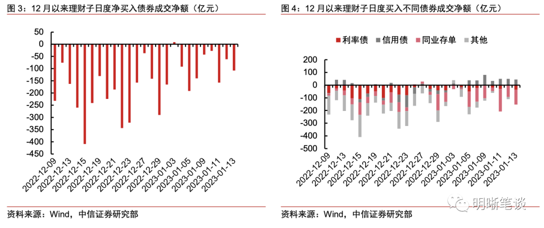 23年1月前两周理财子债券净卖出额显著减小,较12月后两周下降59%至810亿元,其中信用债净买入净额达到333亿元,利率债和资本债等其他债券的净卖出额也在明显减小。根据wind的中债和上清所托管数据显示,11月非法人产品持有国债、政策性银行债、同业存单金额环比下降1266、3652和4768亿元。进入12月后,负反馈影响持续,根据理财子净买入债券成交金额的变化来看,总额上,理财子12月份在赎回潮压力之下连续净卖出,单日净卖出额最高曾在12月15日达到409亿元,12月最后三周的周度净卖出额达到1148、1205、790亿元,在月底出现下降趋势。而进入1月份,周度净卖出额又有明显减小,前两周净卖出额较12月最后两周下降1185亿元至810亿元。从结构上看,信用债(此处信用债口径仅包括中期票据、短融、企业债、资产支持证券,下同)买入情况好转更为明显,信用债已连续7个交易日实现净买入,1月前两周净买入净额达到333亿元,而12月最后两周为净卖出260亿元;利率债和资本债等其他债券的净卖出额下降也较为明显,1月前两周净卖出额分别达到171和189亿元,分别较12月最后两周下降65%和76%。但同业存单净卖出量有一定增加,1月前两周净卖出额较12月最后两周增加322亿元达到783亿元,原因可能在于春节前现金理财大量取现。