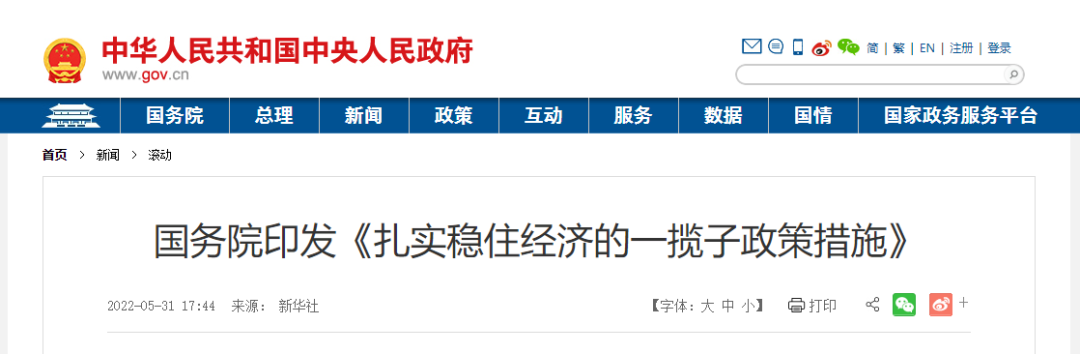 近日,国务院发布《关于印发扎实稳住经济一揽子政策措施的通知》,要求各部门要按照通知提出的6方面33项具体政策措施及分工安排,对本部门本领域本行业的工作进行再部署再推动再落实,需要出台配套实施细则的。