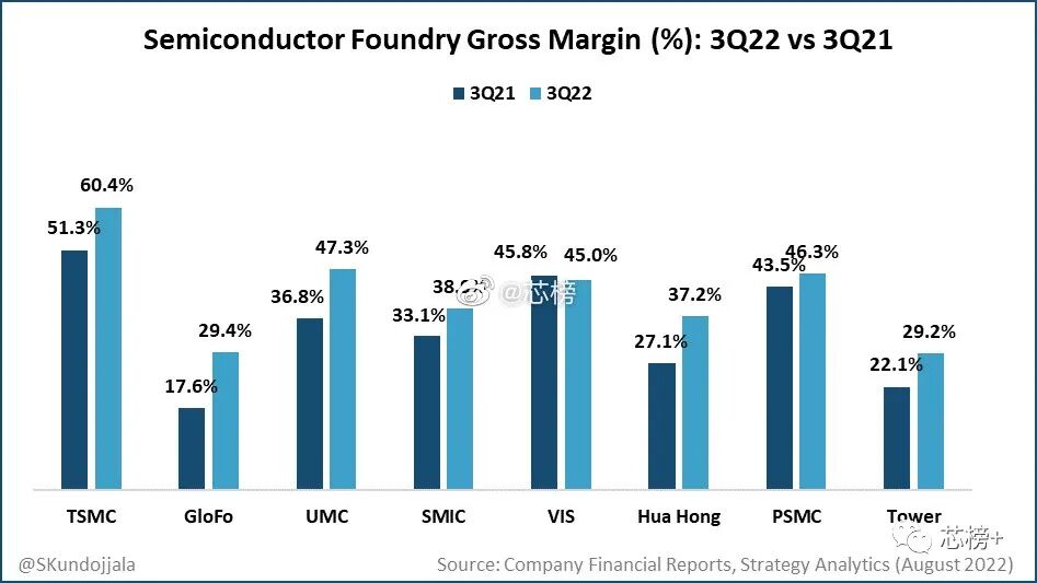 晶圆厂代工毛利率继续保持良好,因为它们将通胀成本转嫁给了客户。受晶圆价格上涨、N5 和汇率的推动,台积电在 22 年第三季度创下历史新高的毛利率60.4%。