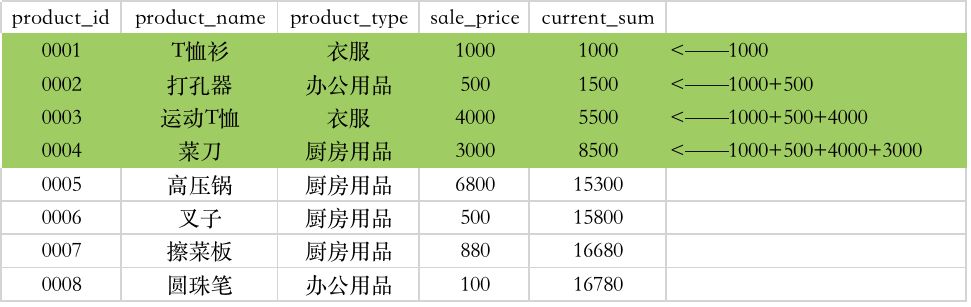SELECT product_id,product_name,product_type,sale_price,SUM(sale_price) OVER(ORDER BY product_id) AS current_sumFROM product;