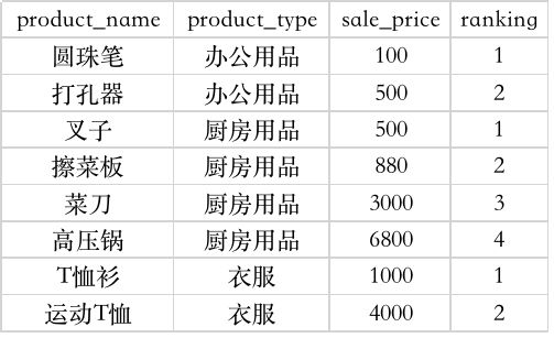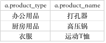--使用窗口函数maxselect a.product_type,a.product_namefrom(select product_name,product_type,sale_price,max(sale_price) over(partition by product_type) as max_sale_price--增加一列为聚合后的最高售价from product) awhere a.sale_price = a.max_sale_price;--保留与最高售价相同的记录数