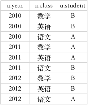 --使用窗口函数maxselect a.year,a.class,a.studentfrom(select year,class,score,student,max(score) over(partition by year,class) as max_score--增加一列为聚合后的最高分from `class`) awhere a.score = max_score --保留与最高分相同的记录数