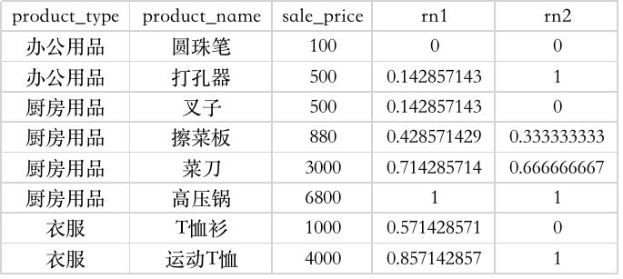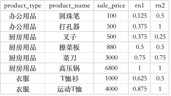 SELECT product_type,product_name,sale_price,percent_rank() OVER (ORDER BY sale_price) AS rn1,percent_rank() OVER(PARTITION BY product_typeORDER BY sale_price) AS rn2FROM product;