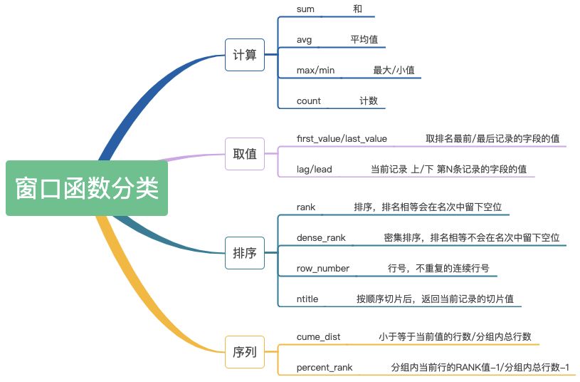 下面的思维导图基本包含了Hive所有的窗口函数,按照窗口函数的功能分为:计算、取值、排序、序列四种,前三种的使用场景比较常见,容易理解,最后一种(序列)的使用场景比较少。