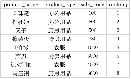 SELECT product_name,product_type,sale_price,RANK () OVER(PARTITION BY product_typeORDER BY sale_price) AS rankingFROM product;