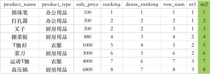 SELECT product_name,product_type,sale_price,RANK () OVER (ORDER BY sale_price) AS ranking,DENSE_RANK () OVER (ORDER BY sale_price) AS dense_ranking,ROW_NUMBER () OVER (ORDER BY sale_price) AS row_num,ntile(3) OVER (ORDER BY sale_price) as nt1,ntile(30) OVER (ORDER BY sale_price) as nt2--切片大于总记录数FROM product;