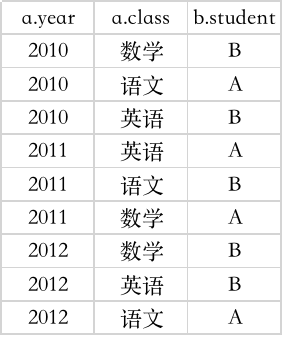 --使用聚合函数select a.year,a.class,b.studentfrom(select year,class,max(score) as max_scorefrom classgroup by year,class) a join class bon a.year = b.year and a.class = b.classand a.max_score = b.scoreorder by a.year