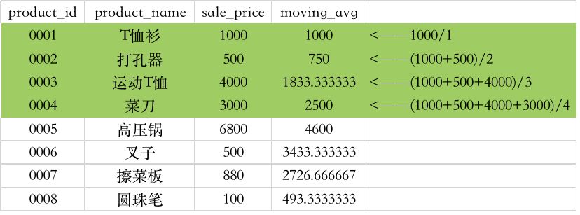SELECT product_id,product_name,sale_price,AVG(sale_price)over(ORDER BY product_idrows 2 preceding) AS moving_avgFROM product;