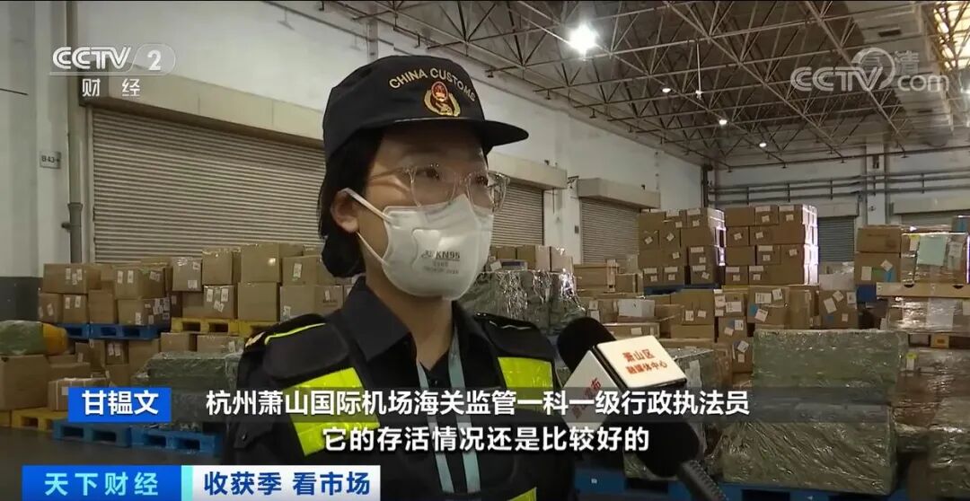 杭州萧山国际机场海关监管一科一级行政执法员 甘韫文:经过现场查验,它的存活情况是比较好的,因此我们现场检疫合格后就快速放行。