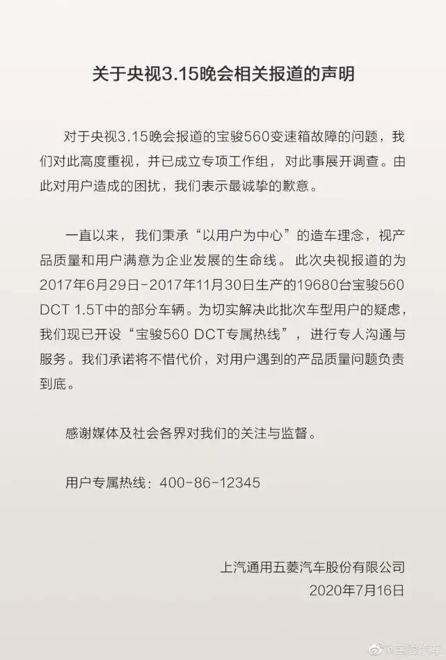 通用五菱致歉:已开设专属热线,对用户遇到的产品质量问题负责到底