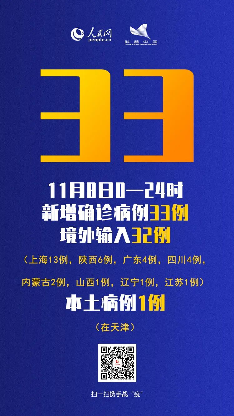 11月8日0—24时,31个省(自治区、直辖市)和新疆生产建设兵团报告新增确诊病例33例,其中境外输入病例32例(上海13例,陕西6例,广东4例,四川4例,内蒙古2例,山西1例,辽宁1例,江苏1例),本土病例1例(在天津);无新增死亡病例;新增疑似病例1例,为境外输入病例(在上海)。