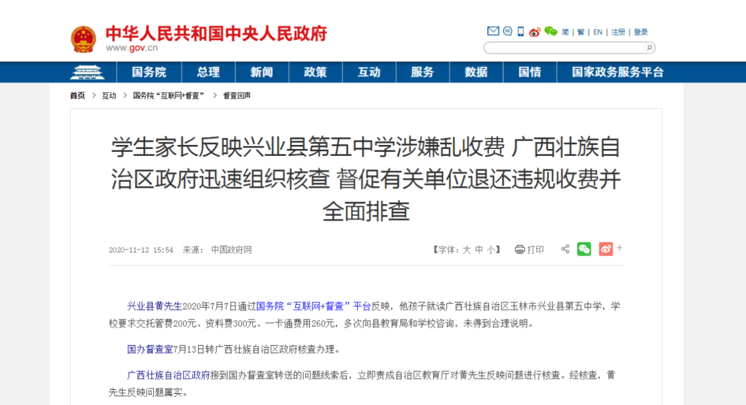 今年7月7日,广西玉林市兴业县的黄先生通过国务院“互联网+督查”平台反映,他孩子就读于玉林市兴业县第五中学,学校要求交托管费200元、资料费300元、一卡通费用260元,多次向县教育局和学校咨询,未得到合理说明。