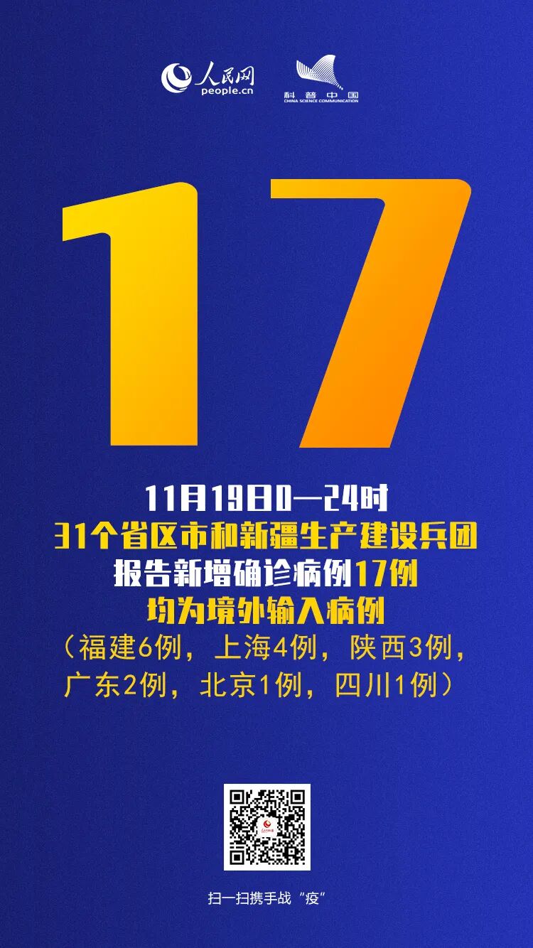 11月19日0—24时,31个省(自治区、直辖市)和新疆生产建设兵团报告新增确诊病例17例,均为境外输入病例(福建6例,上海4例,陕西3例,广东2例,北京1例,四川1例);无新增死亡病例;新增疑似病例1例,为本土病例(在天津)。