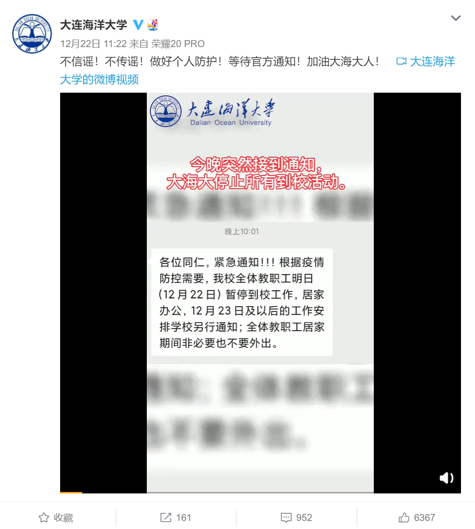 近日,大连海洋大学的情况引发全网关注。“突然接到通知,停止所有到校活动”,学校近期启动应急预案:封闭校园,封闭公寓,禁止出入。该校官博曾发文称:“不信谣!不传谣!做好个人防护!等待官方通知!加油大海大人!”