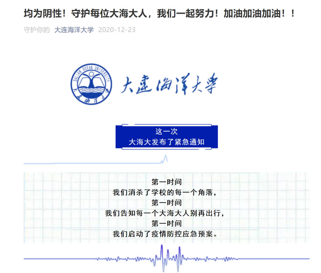信中还提到,疫情出现后,校方启动应急预案,立即封闭校园,紧急调配防控物资,连夜筹备万余名学生饮食供应,严格按照属地要求开展流调溯源,按防控要求将管控人员转移、隔离等,并组织对全体在校师生进行核酸检测,对参加研究生考试和公寓部分学生又单独进行了两轮核酸检测,结果均为阴性。下一步,根据要求还将进行两轮全体在校师生的核酸检测。近日,为整体排查近期去过大医二院的人员情况,有个别学生被带到集中隔离点进行隔离或到医院再做核酸检测,这是疾控部门统一安排,请大家不要恐慌。当前,根据上级防控工作要求,大连市疫情结束前在连高校实施封闭管理,学生不离连。校方将严格按照省、市防控指挥部的指令开展工作,请大家理解、配合!校方会尽最大努力为师生提供较好的生活学习环境,做好师生服务保障工作,承担由于学校放假时间调整,同学们产生的退票、改签费用。“愿春暖花开时,再遇更好的你,再赏那片湛蓝大海!”一时间,评论区加油鼓劲刷屏↓↓↓![]()