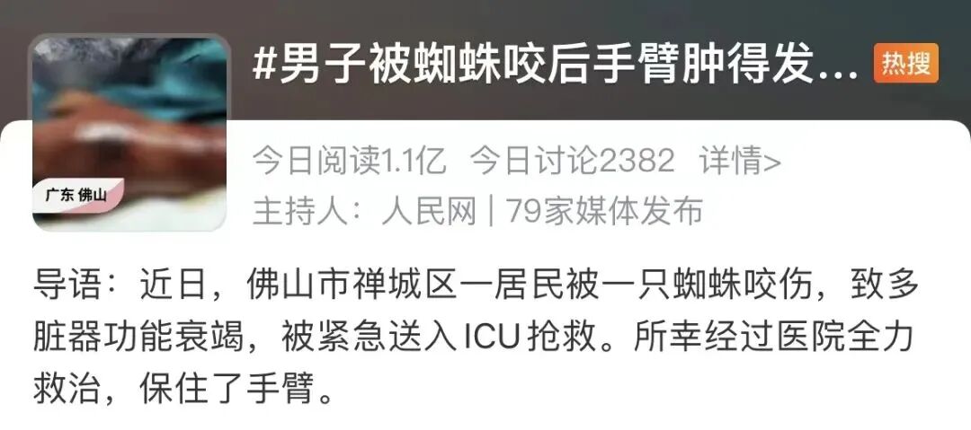 由于何大伯没有将蜘蛛带过来,医生也不清楚他是被何种蜘蛛咬伤。从何大伯的情况也可以反映出,该蜘蛛的毒性非常强。医生提醒,户外活动时尽量穿长袖衣服和长裤,必要时把裤管和袖管扎起来,预防虫类叮咬。
