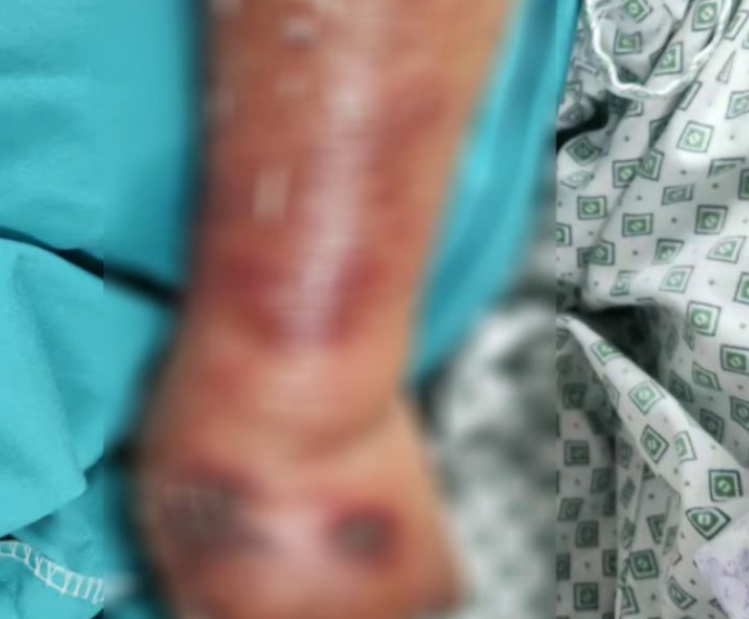 佛山复星禅诚医院重症医学科主任 陶飞:来的时候病人的意识状态已经不太好了,叫他勉强能够应答,神经系统已经受到损伤了,再一个就是呼吸比较急促,给他高流量的面罩吸氧,说明已经出现了呼吸方面的问题。还有血压需要使用升压药维持血压,说明他的循环功能也出现了障碍,整个前臂到胳膊都肿得有些发亮了。