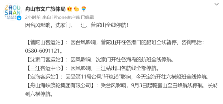 【舟山海峡渡轮集团有限公司】:受台风影响,9月3日起鸭蛋山至白峰航线停航、长峙到六横停航。