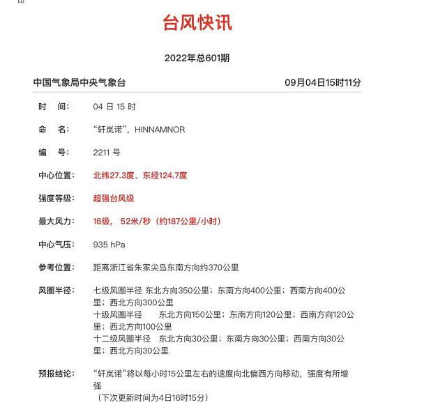 另据自然资源部9月4日消息,今年第11号台风“轩岚诺”(强台风级)已进入我国东海东南部海面,并逐渐向浙江近海靠近,受其影响,东海的浪高将持续增大,上海、浙江近岸海域将出现巨浪到狂浪,国家海洋预报台4日早上继续发布海浪红色警报和风暴潮蓝色警报。