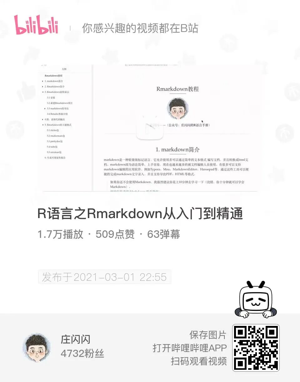 推荐: 可以保存以下照片,在b站扫该二维码,或者b站搜索【庄闪闪】观看Rmarkdown系列的视频教程。Rmarkdown视频新增两节视频(写轮眼幻灯片制作)需要视频内的文档,可在公众号回复【rmarkdown】