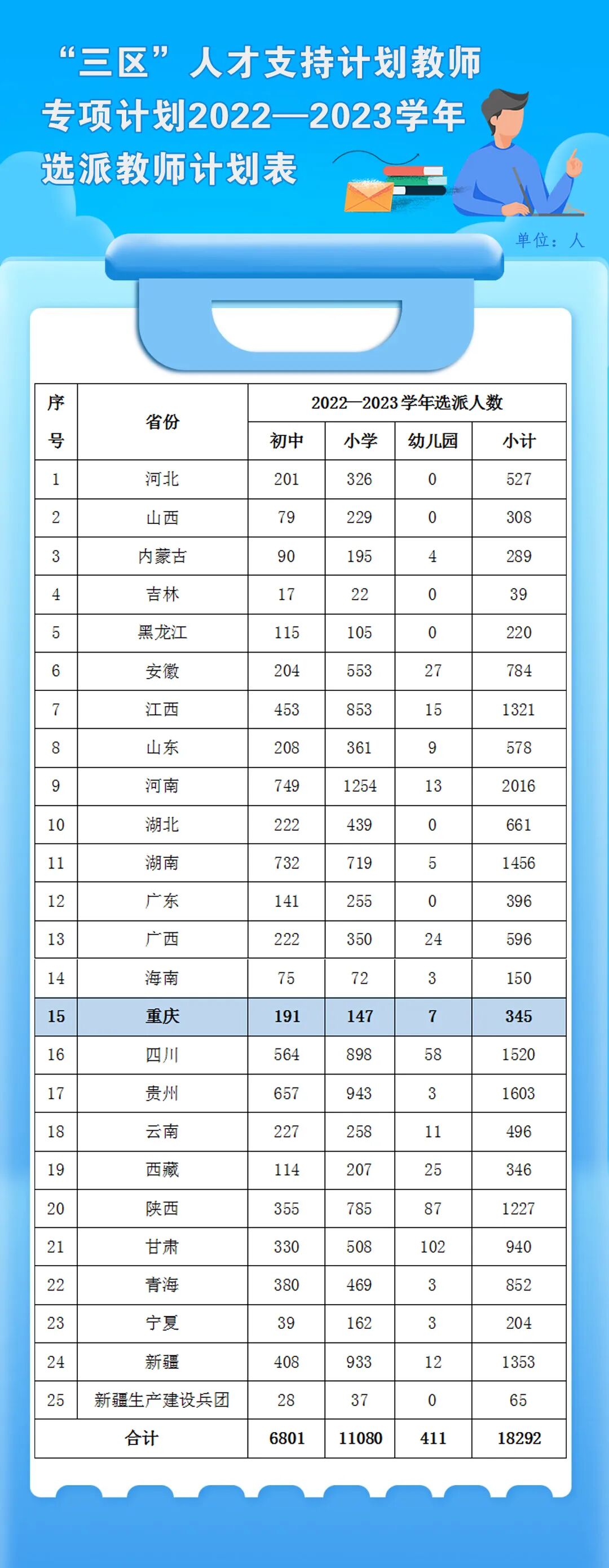 近日,教育部、财政部发布《关于做好2022年“三区”人才支持计划教师专项计划有关实施工作的通知》。2022—2023学年全国计划选派18292名教师到三区支教,具体情况如下——