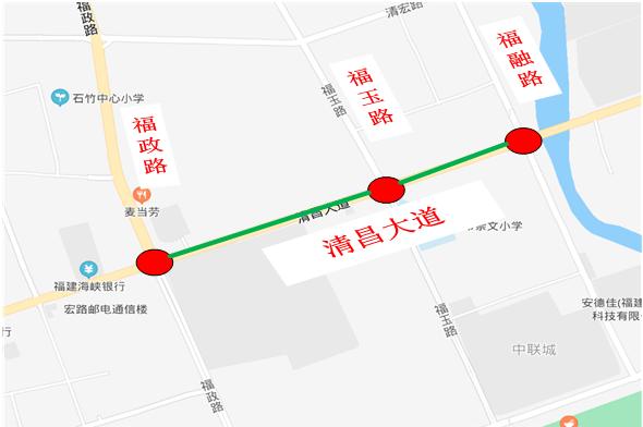 根据清昌大道(福政路-福融路)沿线各路口车流量情况,道路条件及影响绿波因素,在清昌大道(福政路-福融路)平峰时段设计绿波方案,车速50km/h左右,优化后,通过数据显示,东往西方向通行时间缩短了69秒,西往东方向通行时间缩短了72秒,调试效果为双向不停车。具体优化情况见下表1所示。