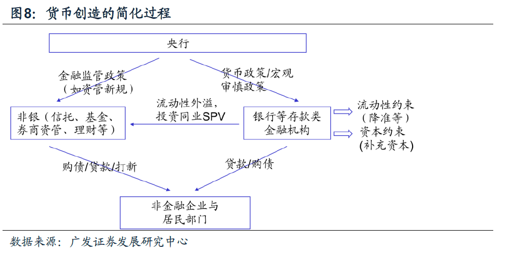 基础货币投放规模由货币政策决定,而金融机构的资产配置行为由宏观审慎政策和金融监管政策(统称为金融政策)共同决定。