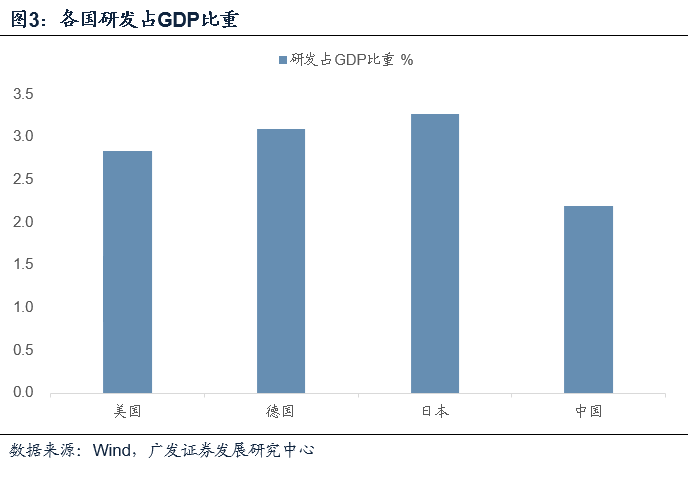而世界银行统计2018年美国、德国、日本研发占GDP比重分别为2.84%、3.09%、3.26%。对比之下中国在研发的GDP占比上仍有较大的提升空间。