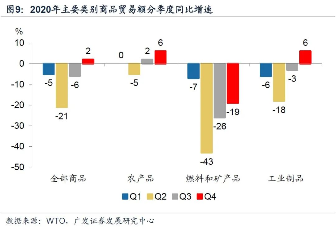 1.关于2021年全球商品出口需求,采用世贸组织最新的中性预测,2021年全球商品贸易额同比增长8%,对应贸易额达到19万亿,相当于回到疫情前2019年的贸易体量。
