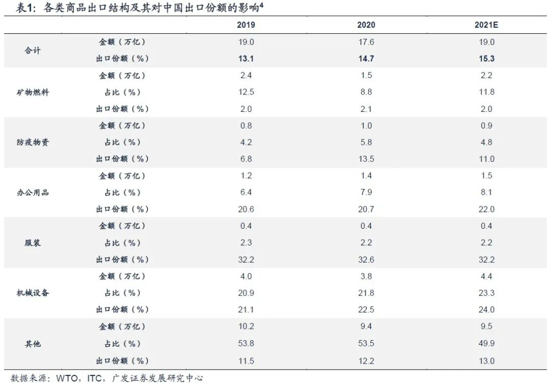 出口份额上,中国矿物燃料出口份额波动不大且近年来持续稳定在2%左右;服装类产品由于成本优势的减弱,近年来出现市场份额的趋势下滑,我们假设其在2021年回落到疫情前32.2%的水平;2021年中国防疫物资出口份额在经历了2020年不可持续的高增(13.5%)后出现回调,我们估计出口份额回落至11%左右。办公用品、机械设备和其他商品出口市场份额,我们分别参照了去年下半年和过去五年份额增长的线性趋势,给定了2021年市场份额的小幅提升。