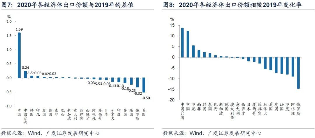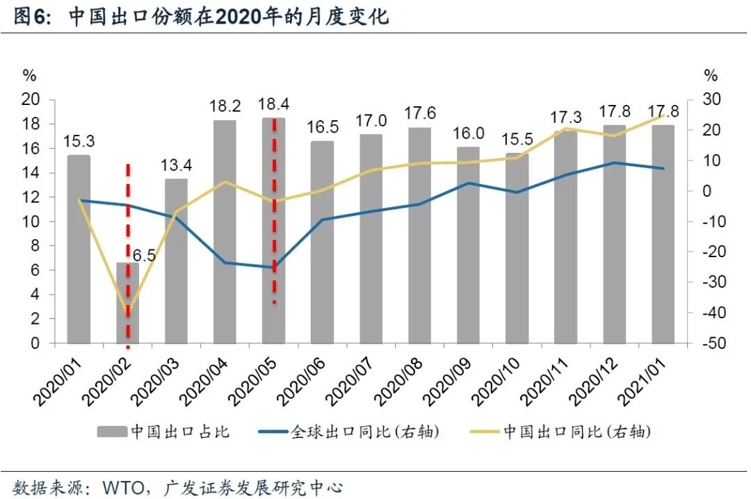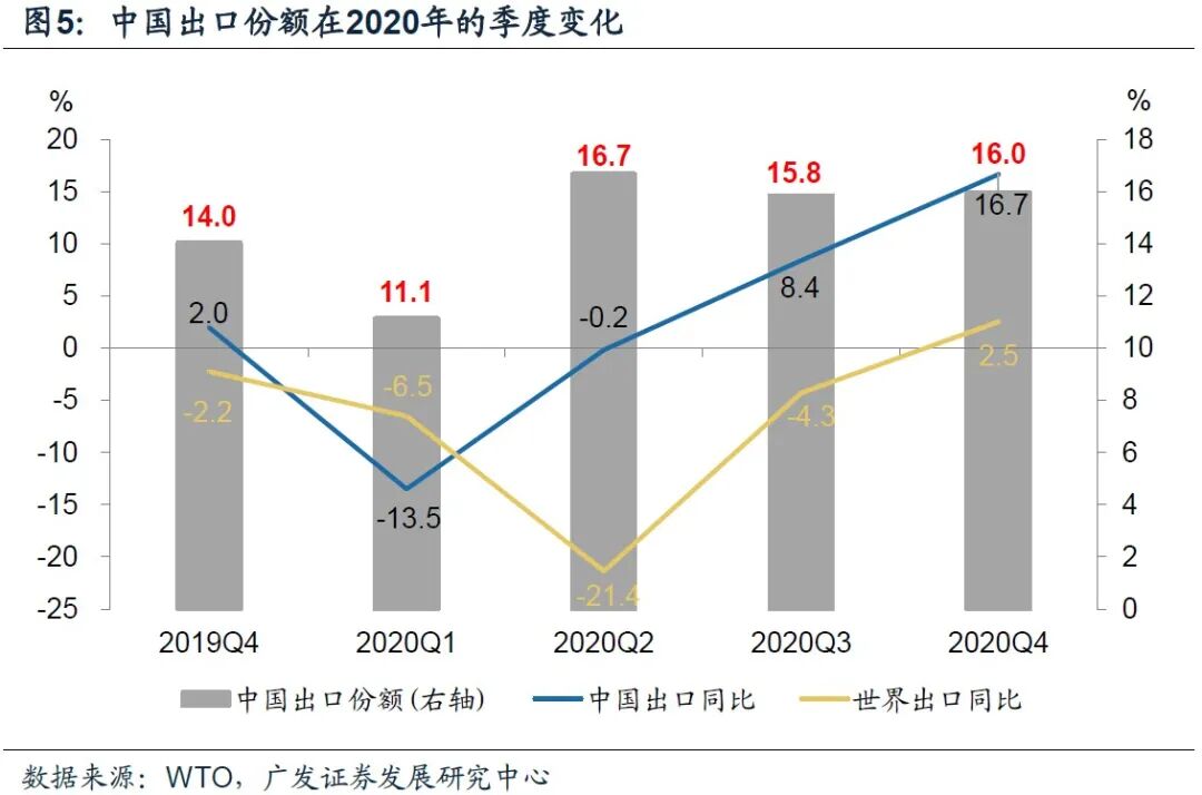 第一,2020年,WTO口径下中国全年商品出口贸易占全球比重14.7%,创下历史新高;四个季度的出口份额分别为11.1%、16.7%、15.8%和16%。