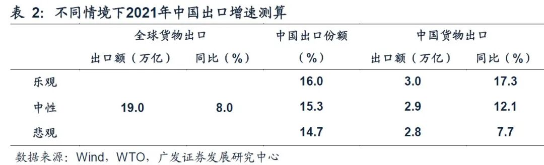在全球贸易共振的大背景下,以WTO中性预测2021年全球出口贸易额增长8%为基准,2021年中国出口份额15.3%(各类商品出口份额经过贸易权重调整加总)对应出口同比增速12.1%。在2020年同比3.6%的增速基础上,将连续两年实现出口贸易的强劲增长。