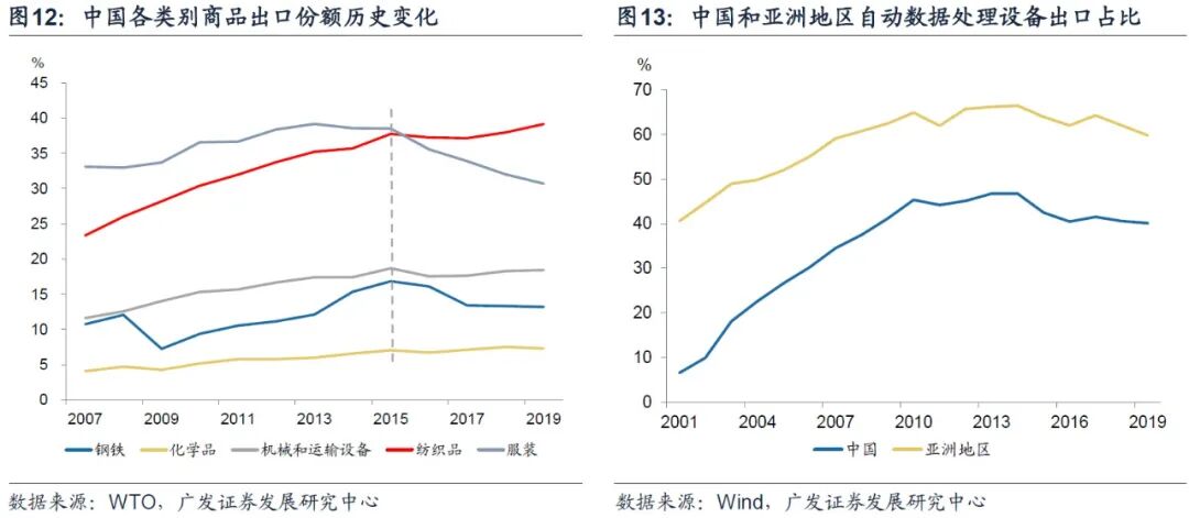 疫情对需求结构形成的正向冲击主要体现在:防疫物资和“宅经济”相关需求,这从需求层面支撑了东亚经济体出口份额的提升。2020年中国出口纺织品、医疗器械、药品合计同比增长31%。防疫物资中很大部分是以口罩为代表的纺织品,而中国纺织品在全球的出口份额达到近40%(图12),且纺织品也是中国劳动密集型产品(纺织品、服装、鞋类、皮革制品、家具、玩具、箱包)中,出口份额在2015年以后仍然不断上升的少数品类。居家办公、居家教学所带来的电脑、家用电器等商品需求的高增长,中国2020年笔记本电脑、平板电脑、家用电器合计增长了22.1%;中国台湾地区数据也显示,2020年下半年显示面板产值同比增长11.2%,创下2013年以来同期新高。[3]