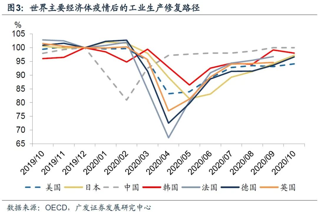 第一,当前海外主要经济体的生产修复已经进入后半程。尽管美欧等海外经济体出现了疫情的不断反复,但以OECD生产指数来观测,自2020年8月份开始,主要经济体的生产指数已经修复至疫情前的90%以上,四季度开始修复程度进一步向95%以上迈进(图3)。
