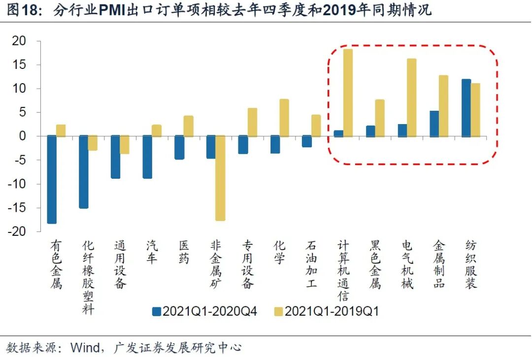 随着海外经济进一步回归正常化,2021年海外需求主线向“出行经济”(燃料、服装)和投资活动(钢铁、机械设备)转换。这可以从2021年一季度出口订单相对去年四季度改善程度得到印证,出口订单环比改善最明显的行业集中在纺织服装、金属制品、电气机械、黑色金属、计算机电子信息行业(图18)。