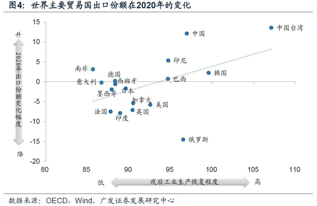 第二,生产恢复程度和能力是各经济体抢占出口份额的必要条件,但不是充分条件。从各经济体出口份额在2020年的变化幅度与生产的恢复程度来看,疫后生产恢复较强的经济体往往都实现了出口份额的改善,但并不是所有生产恢复较快的经济体都必然能够抢占出口市场,如俄罗斯(图4)。